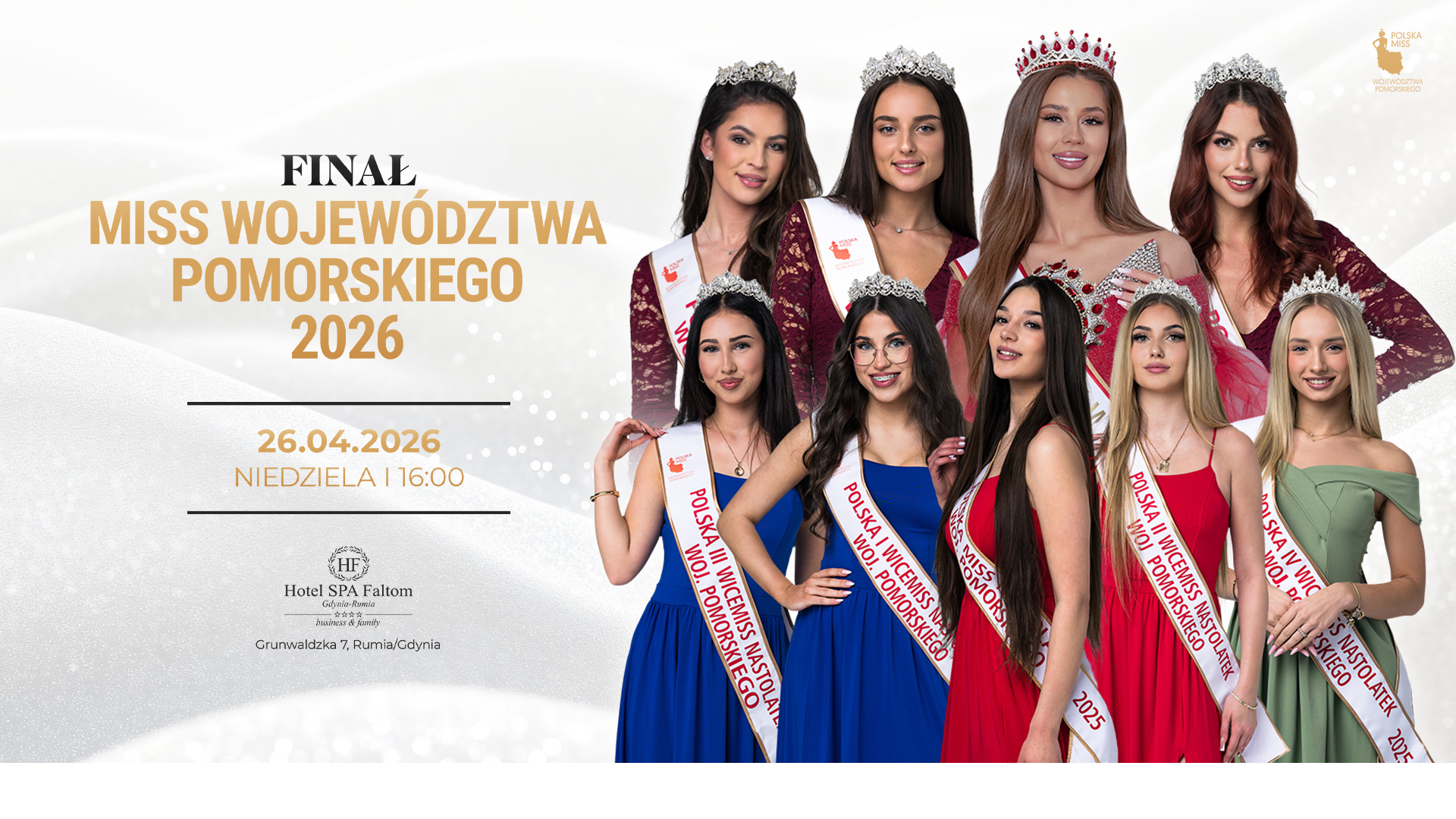 Polska Miss Województwa Pomorskiego to najbardziej prestiżowy konkurs piękności w regionie i oficjalna przepustka do ogólnopolskiego finału Polska Miss. Tu zaczyna się droga do tytułu najpiękniejszej Polki! Jeśli marzysz o koronie, rozwoju i niezapomnianych przeżyciach – jesteś we właściwym miejscu.